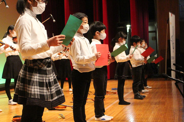 大人の教室の皆さんによる優雅な「人生のメリーゴーランド」「アヴェ・マリア 」を挟み、大人も加わり子どもと一緒に「キラキラ星」を演奏しました。