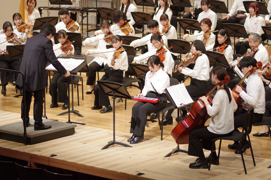 この曲には、2024年に亡くなられた詩人の谷川俊太郎による同名の詩の朗読が付けられており、ナレーションはメンバーのひなのさん(高1)が担当しました。スティールパンやハープなどの特殊楽器、そしてアコーディオンには佐藤芳明さんをお迎えし、複雑でいて心地よい波のような音楽と「でもわたしはきっと / うみよりももっととおくへいける」と結ばれる詩に乗せ、オーケストラとナレーションが一体となって少女の成長を表現しました。